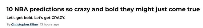 在季前赛火热进行之际,美媒《fansided》晒出对于NBA新赛季的10个大胆预测,其中包括詹姆斯赛季中期宣布退役,以及勇士队无缘季后赛。